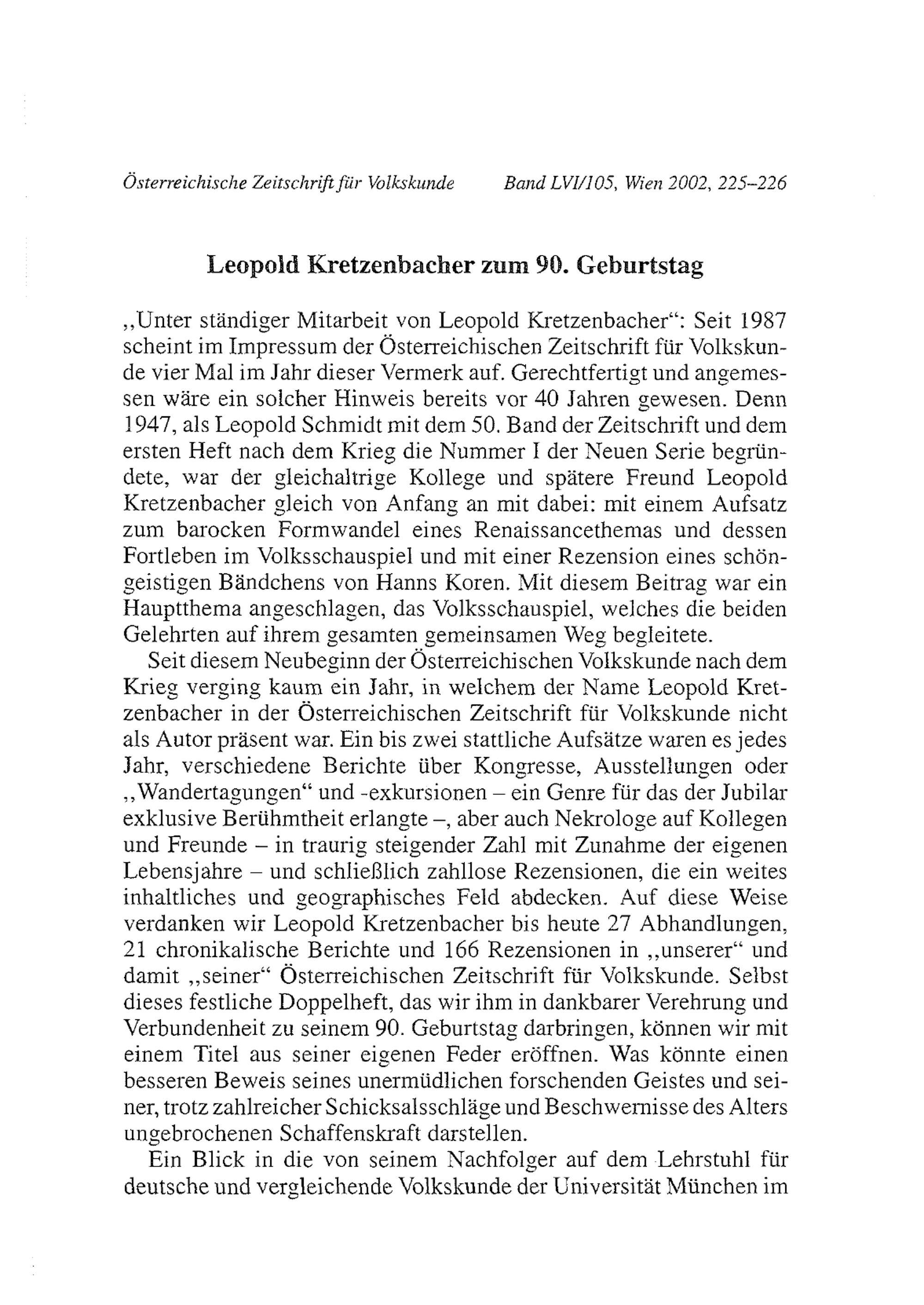 Schindler, Margot: Leopold Kretzenbacher zum 90. Geburtstag