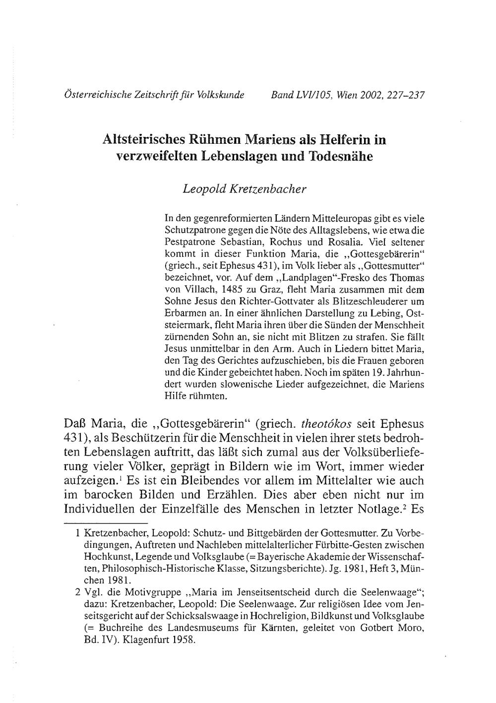 Kretzenbacher, Leopold: Altsteirisches Rühmen Mariens als Helferin in verzweifelten Lebenslagen und Todesnähe